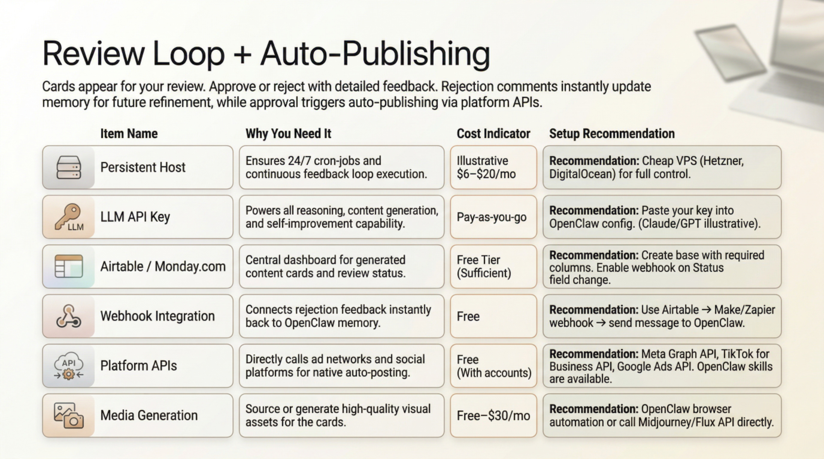 | Custom skills (one-time) | Airtable sync, topic research template, feedback learner | Free | 1. Enable ClawHub (auto-downloads community skills). 2. Prompt OpenClaw once: “Create skill: push topics to Airtable, pull feedback, generate platform-specific content, publish on approval.” It literally writes and installs the skills for you. |