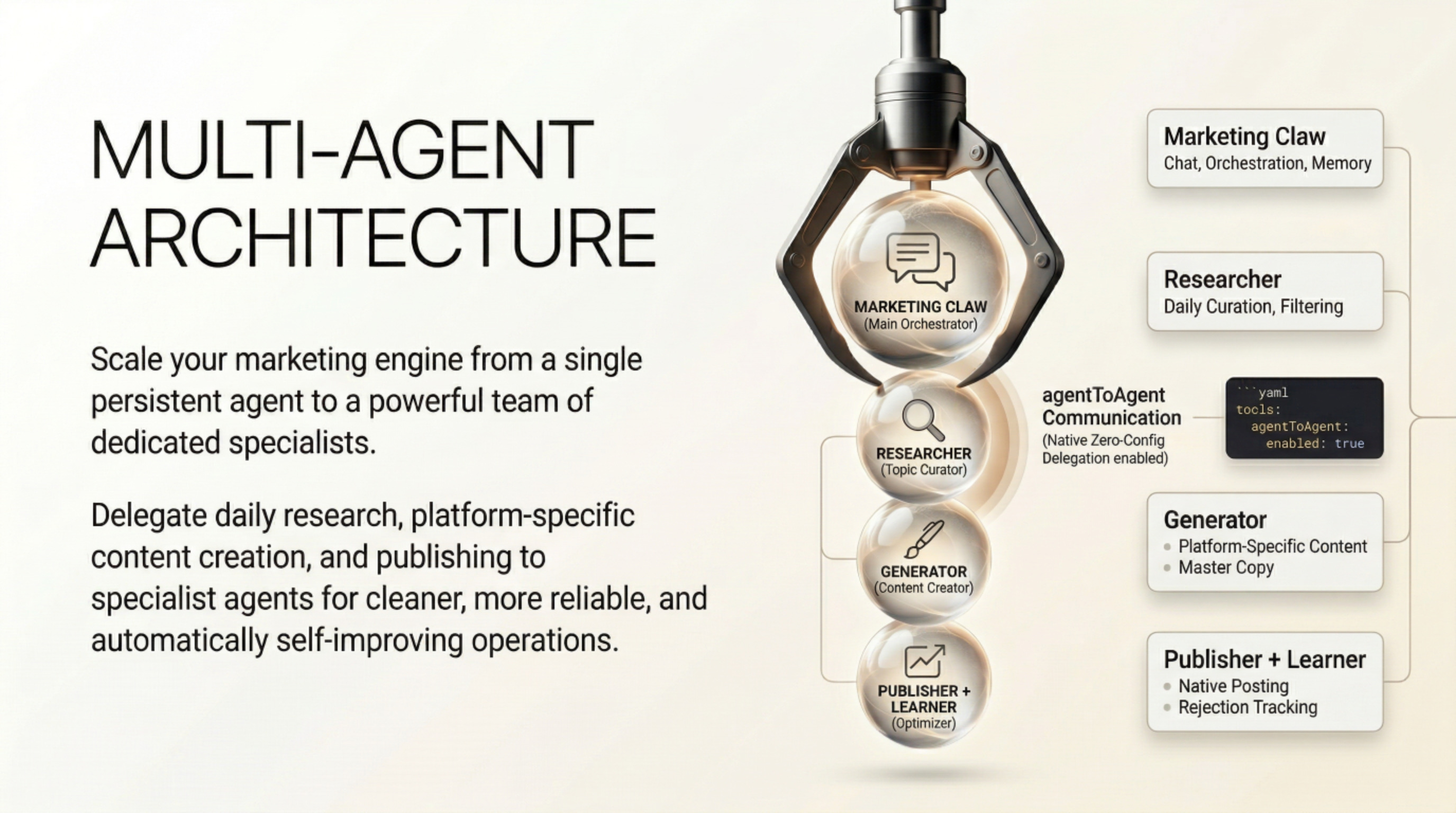 “I want a full Marketing Claw multi-agent team for daily topic curation → platform-specific content generation → Airtable review → auto-publish with feedback learning. Create the four agents, enable agentToAgent, and generate the five core skills: topic-curator, content-generator, airtable-sync, feedback-learner, auto-publisher.”