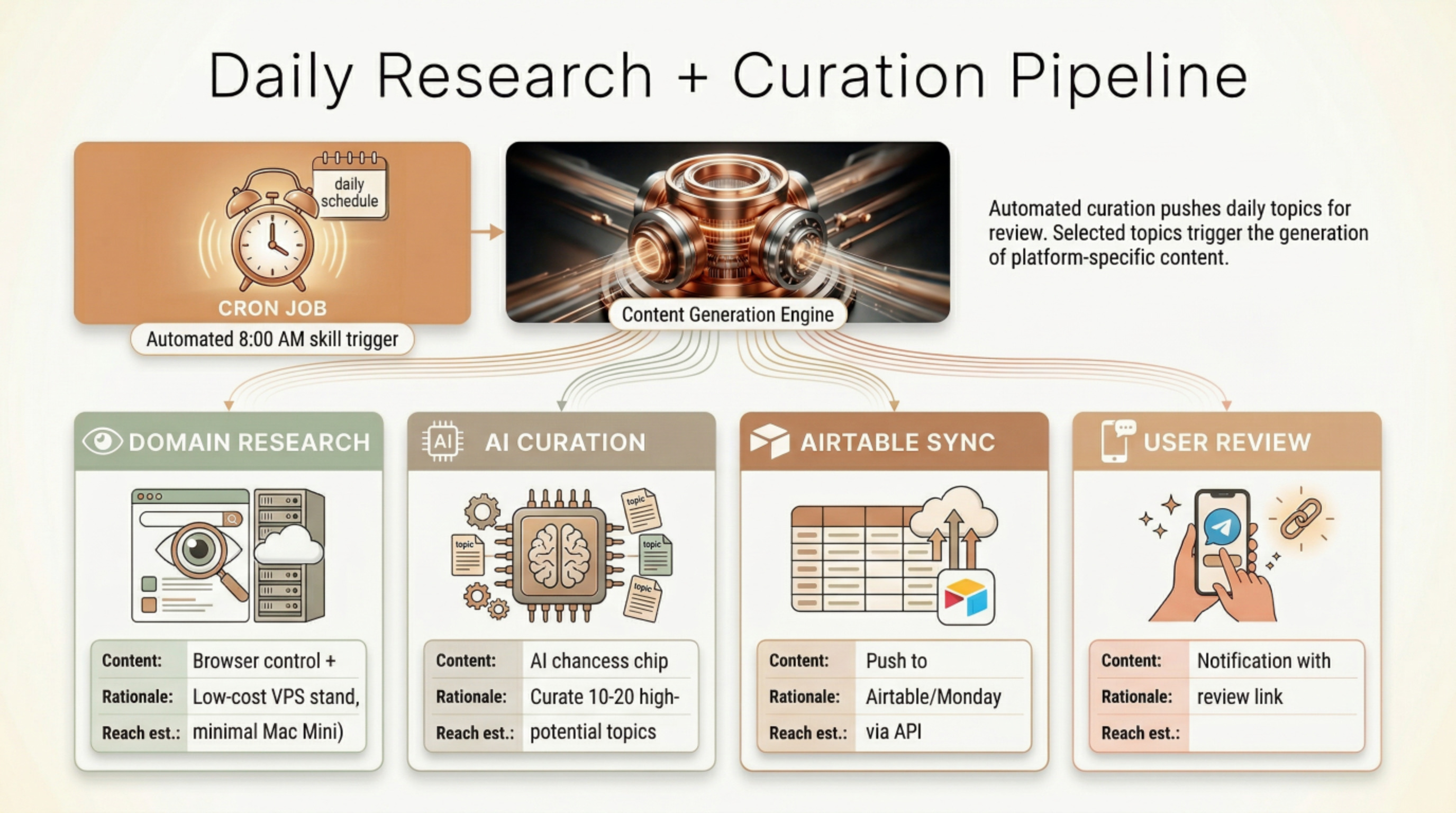 - Day 1: Setup + first 10 topics appear in Airtable.